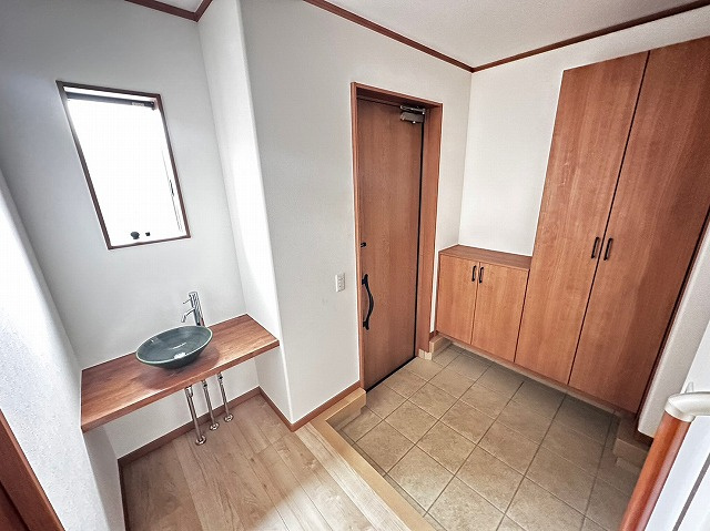 広々とした玄関。入ってすぐに手洗い場があります。手洗いうがいもこれでバッチリ。