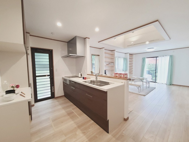 カウンターキッチンタイプで、料理をしながらリビングの様子もばっちり確認できます。すぐそばには勝手口もあり、使い勝手は良好。